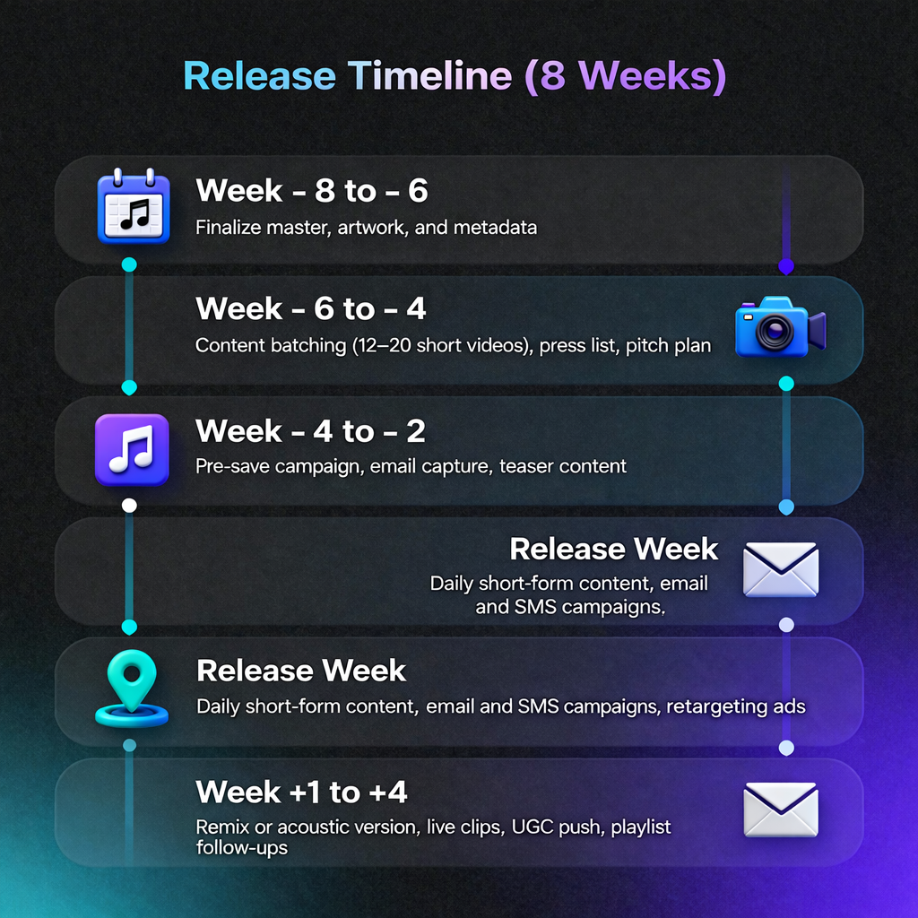 • 3 hooks (chorus, verse bar, instrumental drop) × 4 angles (story, tutorial, performance, meme) = 12 posts per song.